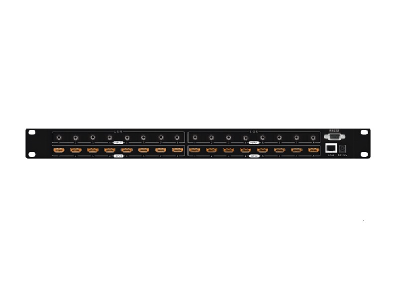 1.支持8路高清信号源输入,8路高清信号源输出,采用HDMI母座接口; 2.支持8路独立音频输出,采用3.5模拟音频输出; 3.输入输出支持HDMI 2.0,支持 4K x 2K@30Hz,1080P@120Hz,和1080P 3D@60Hz; 4.支持LPCM 7.1CH, 杜比True HD, 杜比数字+和DTS-HD Master Audio 传输; 5.支持音频解嵌,音频加嵌; 6.支持任意信号源在多个显示器上同时显示; 7.支持任意HDMI显示器随时查看任意HDMI信号源; 8.8个输入端口支持独立EDID; 9.支持RS-232, 遥控, 面板控制以及Web 以及APP控制; 10.前面板LCD 显示屏反馈实时状态。 |